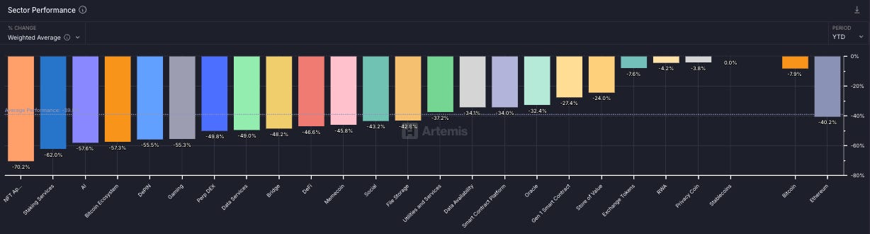 We’ve talked about the trend of dispersion between BTC and other sectors before, and it continued this quarter. Literally nothing outperformed BTC, notably including ETH which is down almost 40% itself as ETH/BTC ratio continues to make new lows.