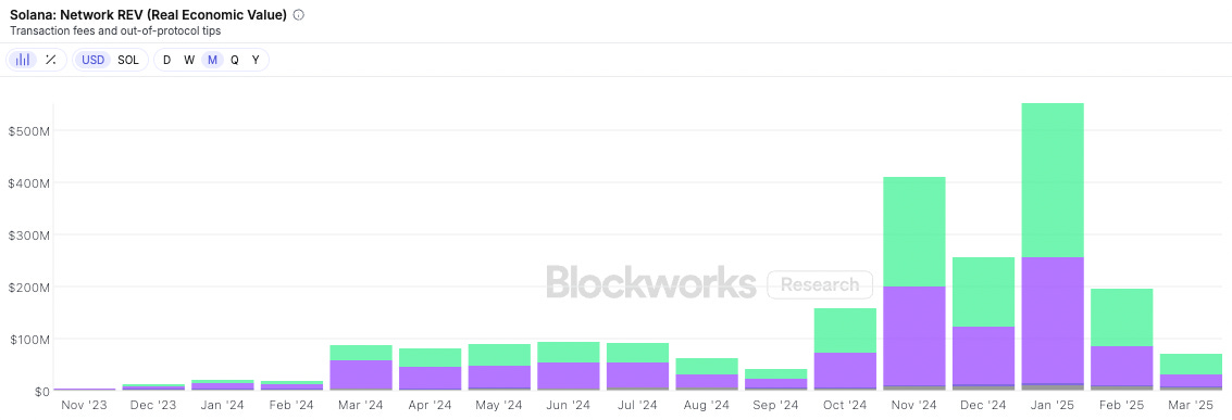We also remain overweight SOL, though we did reduce the position in February. It was a boom and bust quarter for the network even by crypto standards, marked by a new ATH ($284) in January, followed by a precipitous sell-off in March to ~$130. This tracked network activity, which peaked with the launch of the TRUMP meme coin in January and generated an astounding $550M in fee revenue. That number dropped below $100M in March as meme coin trading activity cratered. This all coincided with an unlock of 11m tokens in early March (the largest to date), which was well understood by the market but poorly timed, as shown by price action.